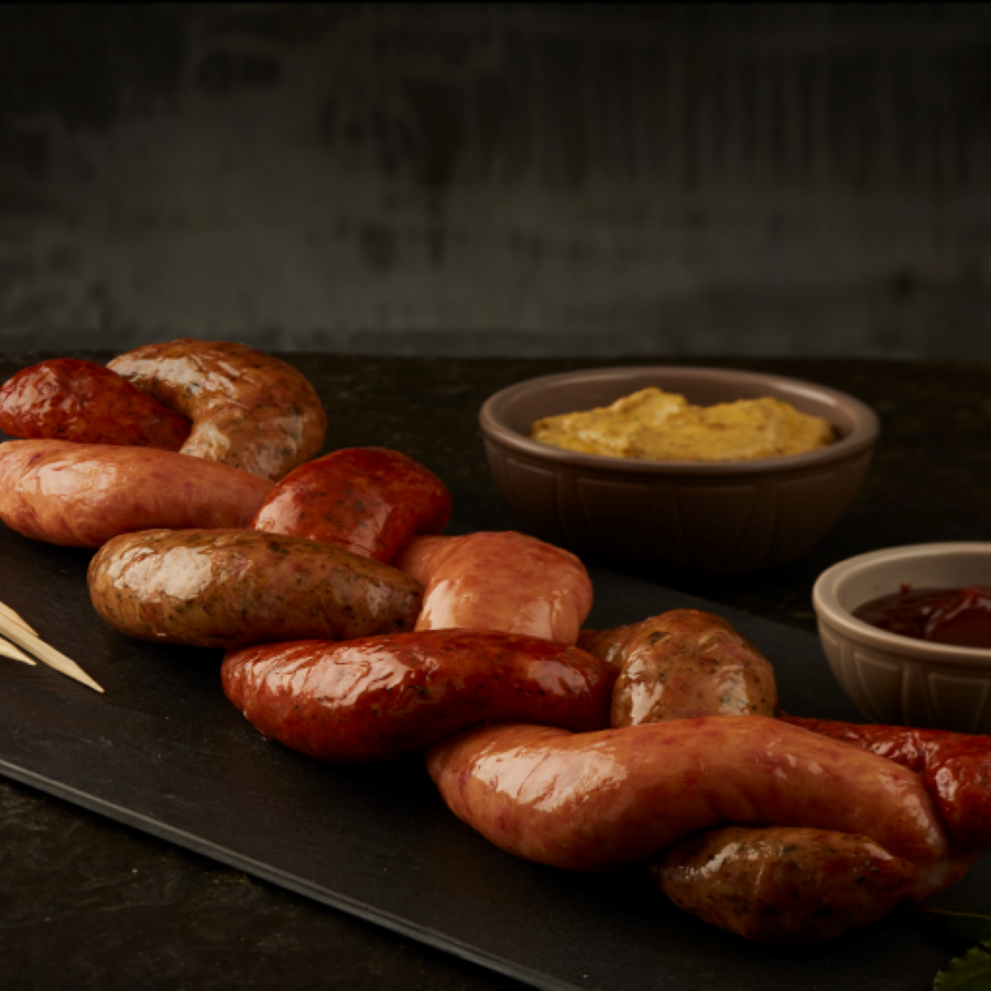Chorizo Mixto x 1000g, el original de la Fazenda con su característico color y sabor a pimentón, una elaboración con finas hierbas y una versión con implementación de condimentos suaves, todos hechos a base de cortes seleccionados de cerdo
