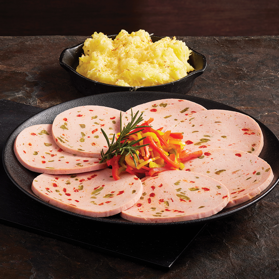 La fina mortadela de cerdo, se viste de navidad con el toque del pimiento fresco rojo y verde, dale vida au mesa y disfruta del encanto de las fiestas.